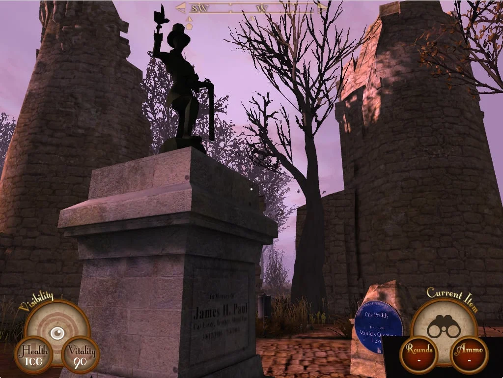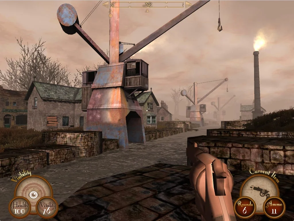 As you've probably discerned from the language of the title and the setup, this game is very Steampunk in style. The technology and aesthetic is all clockwork hodge-podge and brass plating, extending to the landscape, your inventory, and of course, your enemies. The robots are probably the biggest highlight of the game. As you progress, so too do your enemies, from simple shotgun-armed hunters to packs of robotic dogs that literally shout "WOOF" to jet-mounted riders that blast train noises instead of bugles. Observing these varied opponents and learning their schedules, weaknesses, and patterns is vital to your survival.