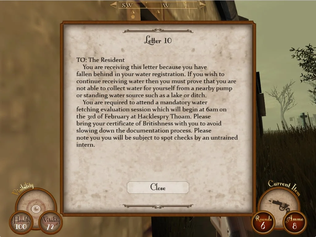 But moreover, the few insights you get into the humans that populated this world - usually from old letters you discover - paint a portrait of a society of total ninnies. It's a very British kind of sensibility reminiscent of Monty Python's best.
