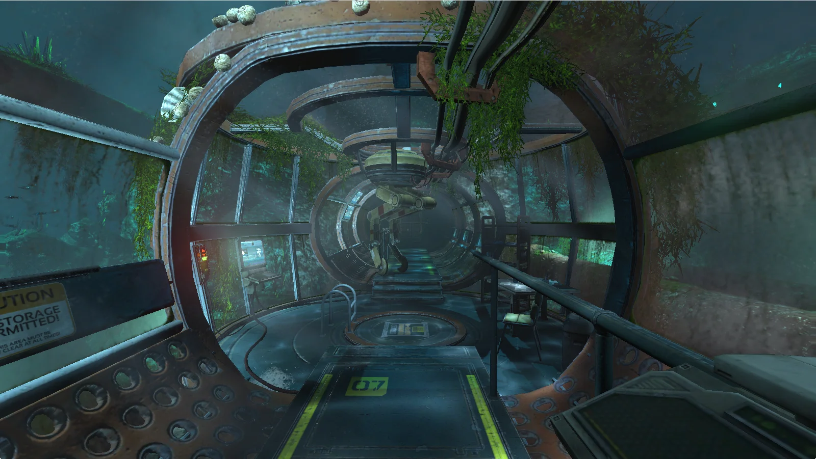 So, since I'm going to try to refrain from talking about the plot, let me instead talk about the graphics, the gameplay, and the design. First off, this game is GORGEOUS. The environments are unique and varied. The base in which the game takes place features several different sub-stations, each with their own aesthetic and purpose that is readily apparent. The underwater sequences are especially brilliant, showcasing the biodiversity and colour of the ocean in a way that I've never seen before in a video game. You encounter fluorescent fish, underwater spiders, drifting seaweed...one very notable highlight I didn't even click on at first glance was a sunken submarine, half-buried in the seabed and blending in with the rock.