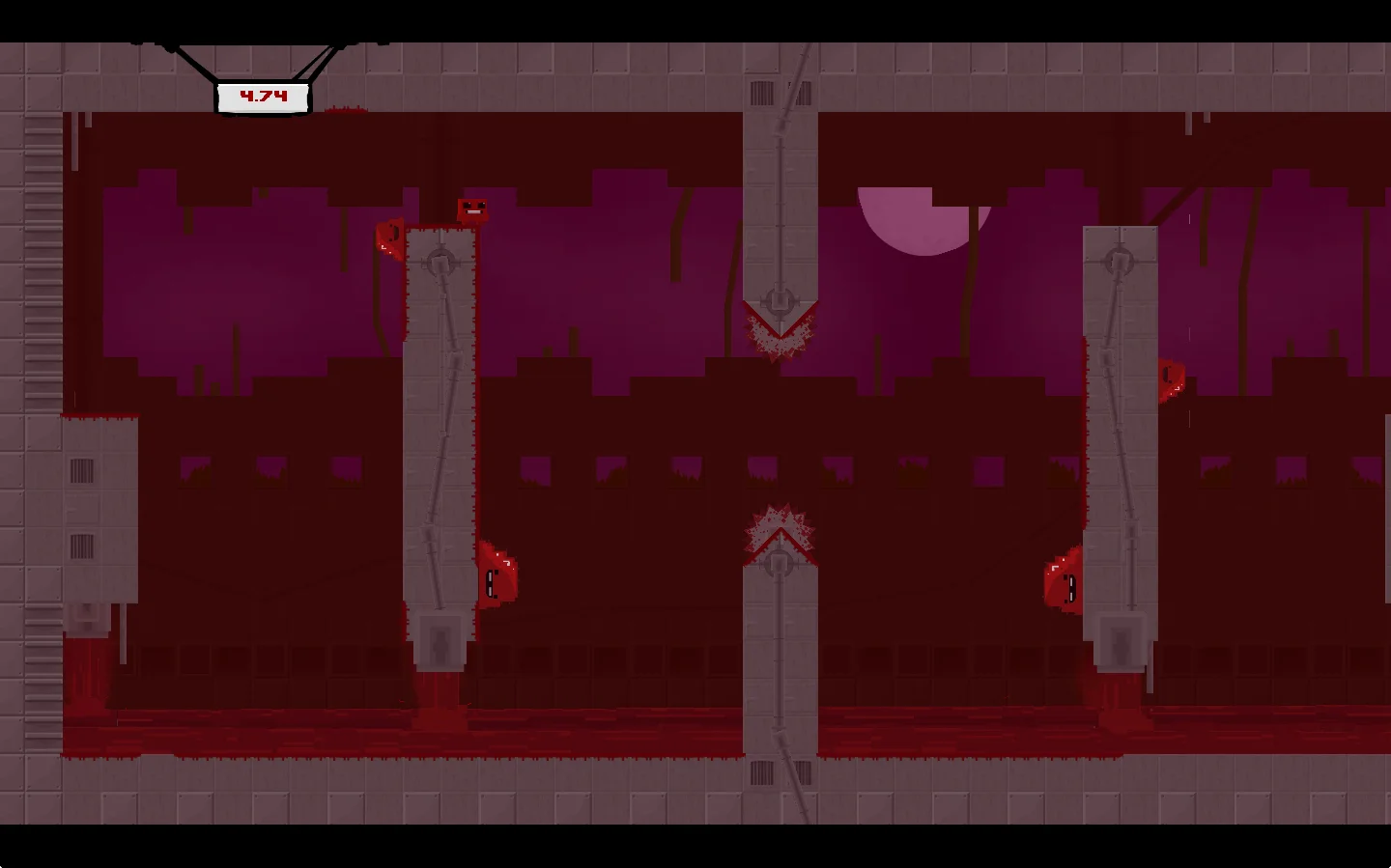 The game also takes great joy in its squishy, squelching sound effects and visuals. Meat Boy leaves a trail of meaty blood everywhere he runs, ramming into walls and ceilings, his body slapping about like a side of beef. And when you do meet (meat?) your end at one of the vicious traps, you splatter apart into tiny chunks, leaving behind an ever-increasing layer of viscera and goop.