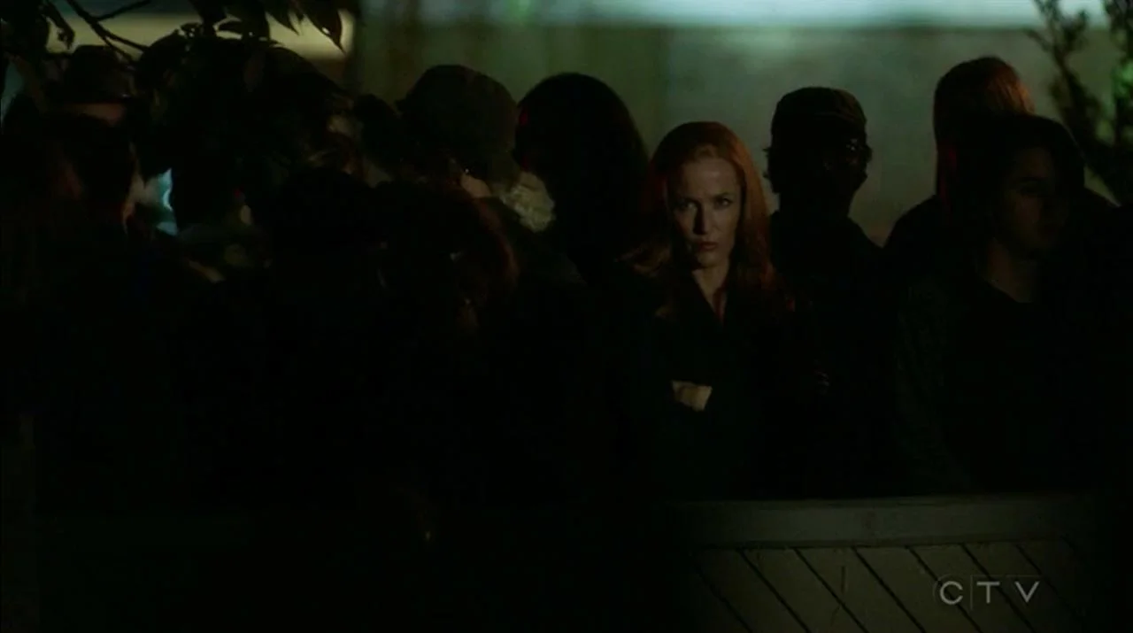 There’s little time to chew on this, because soon Mulder wakes up from sleep to get a drink of water and in a distinctly unsettling jump scare scene, sees his double peeking out at him from the shower. Panicked, he goes to wake up Scully who is definitely NOT wearing the pajamas she had on when she first got into the bed with Mulder. To quote Mandy Slade in Velvet Goldmine, “it doesn't necessarily prove sex was involved. It does, however, make for a very strong case,” especially when Mulder tells Scully to “put a dimmer on that afterglow.”