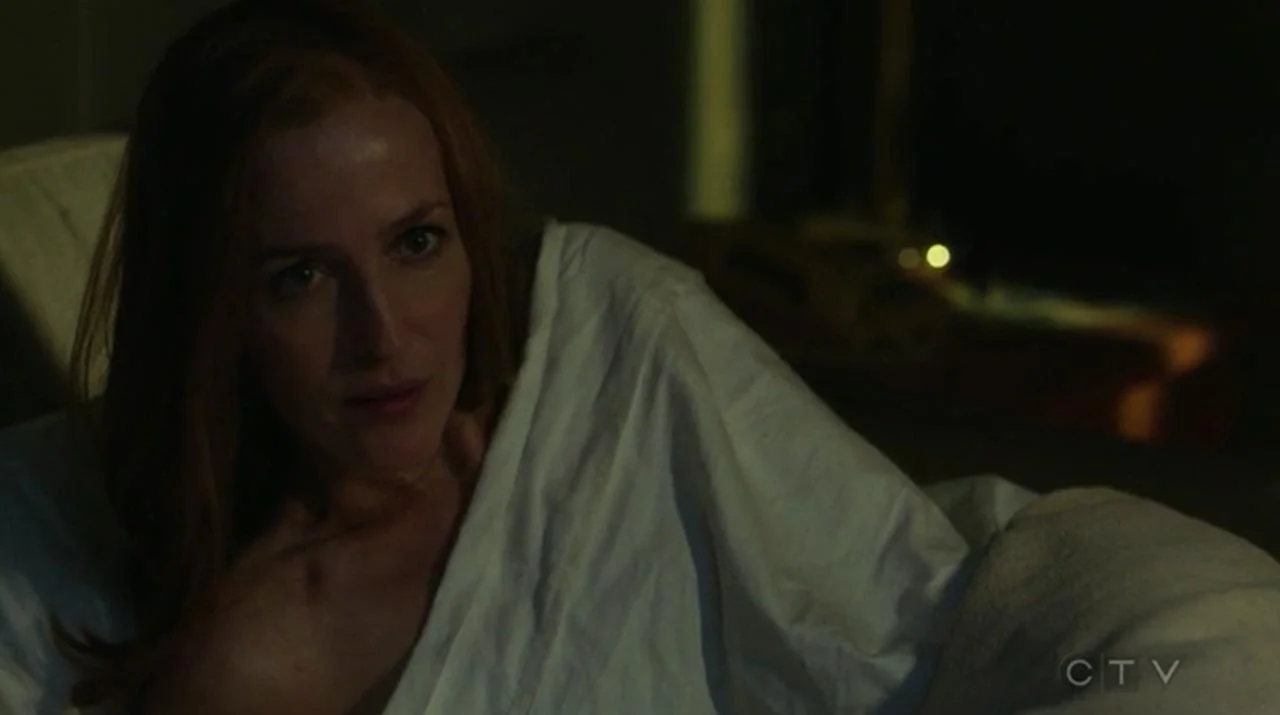 Yet, if you look back to the post-coital shot when Mulder gets up to get water, Scully is shown on the side of the bed that isn’t the one she got into. Granted, her shifting position could be explained by their sexual activity, but it could also beg the question of whether or not this really happened. Are we to assume this is some kind of alternate universe, much like the one Scully imagined in Season 10’s “Founder’s Mutation” episode?